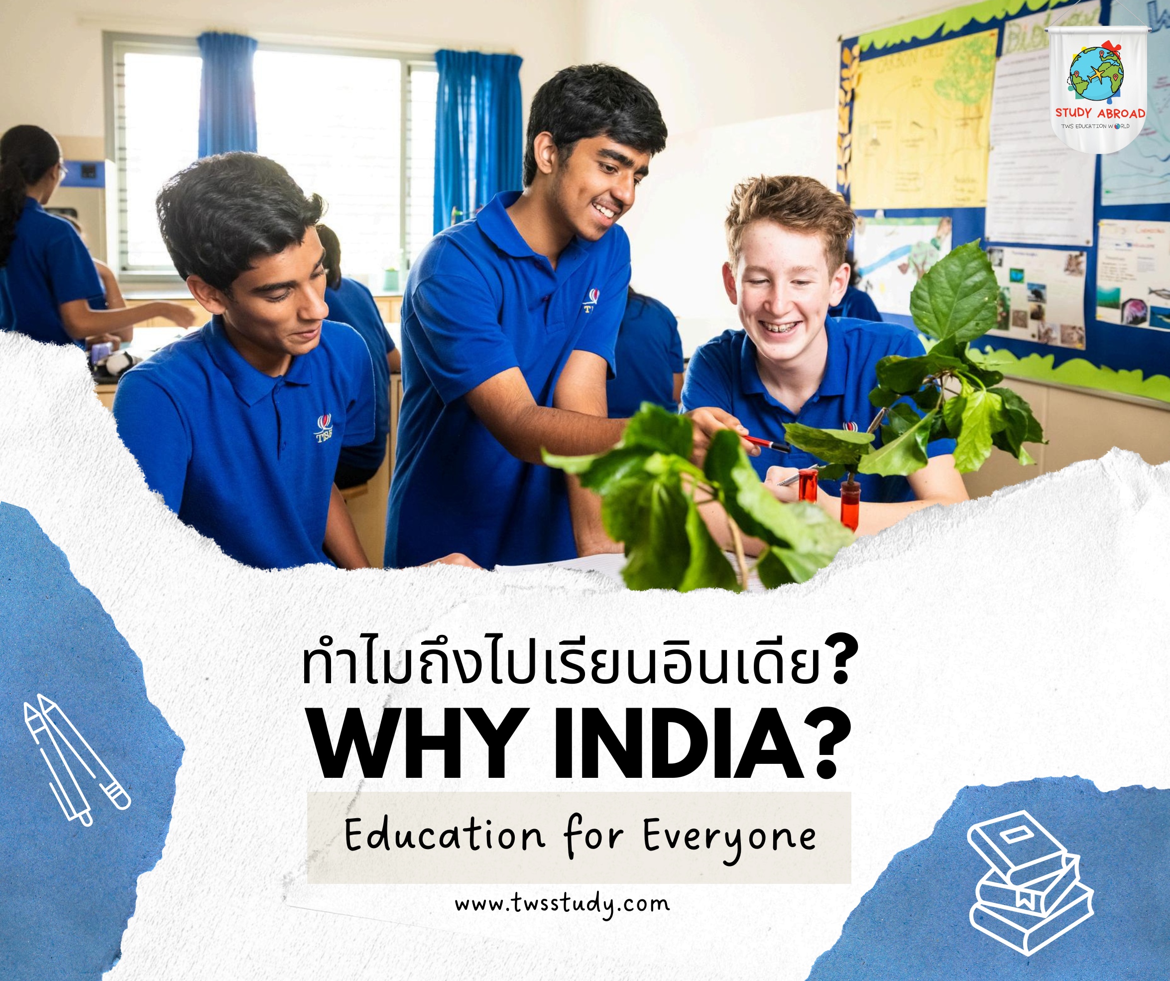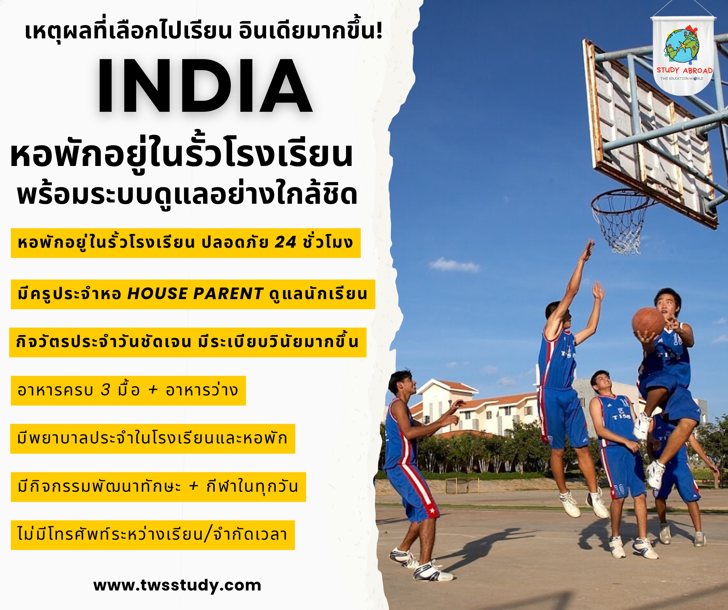 เปิดโอกาสให้นักเรียนไทยได้สัมผัสประสบการณ์ในโรงเรียนนานาชาติ เรียนรู้ร่วมกับเด็กอินเดียในห้องเรียนและหอพัก พร้อมกิจกรรมสนุกสนาน พร้อมทีมงานคนไทยดูแลนักเรียนทั้งไปและกลับ